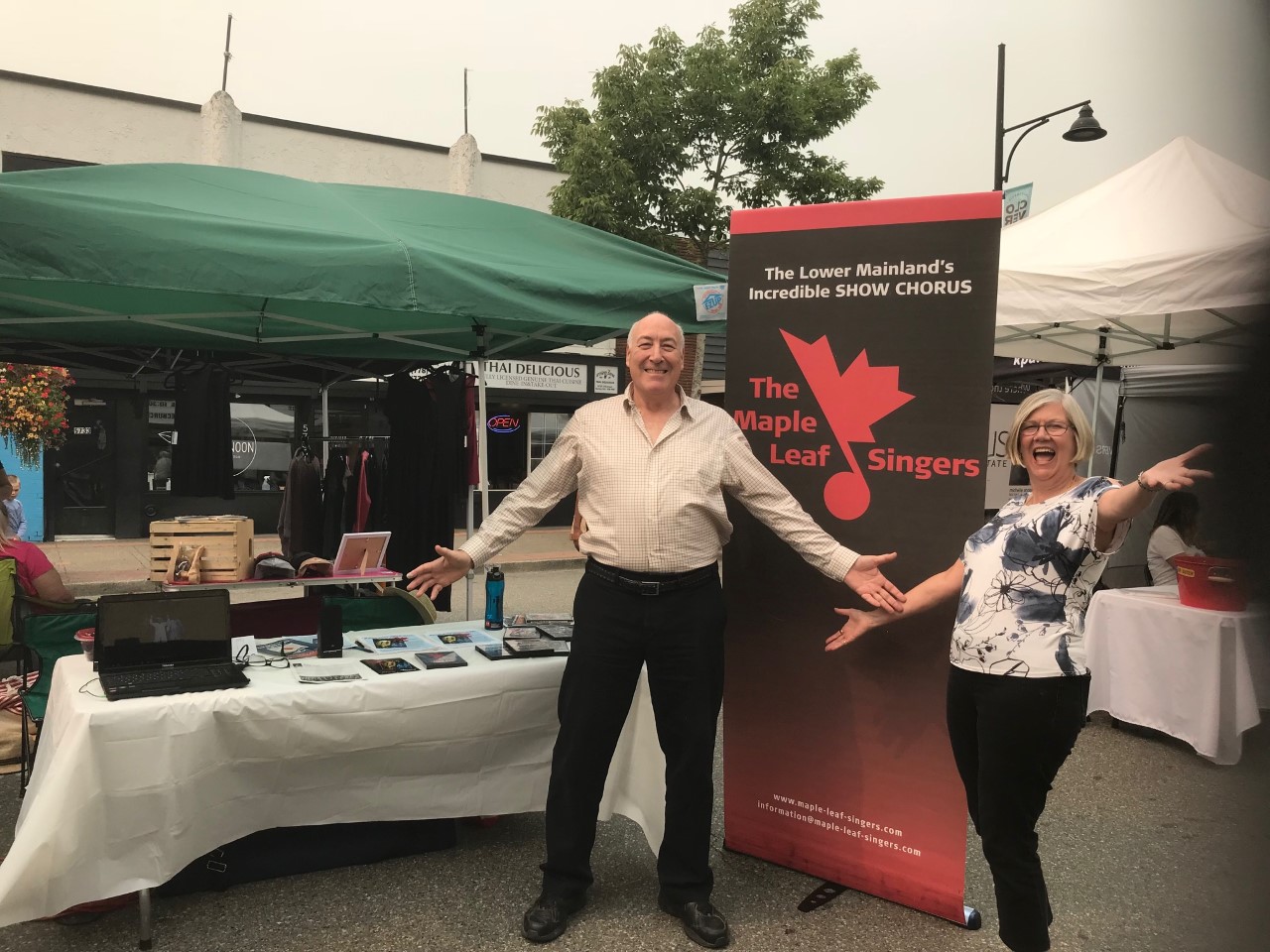 Our main focus the past few months has been auditions and finding new members.  Some of you may have seen us at a booth at the Cloverdale Market on August 18th.  We spoke to many people who had never heard of the Maple Leaf Singers.  We’re looking to change that, so expect to find us at more venues like this!  We’re spreading the word and getting our name out there.